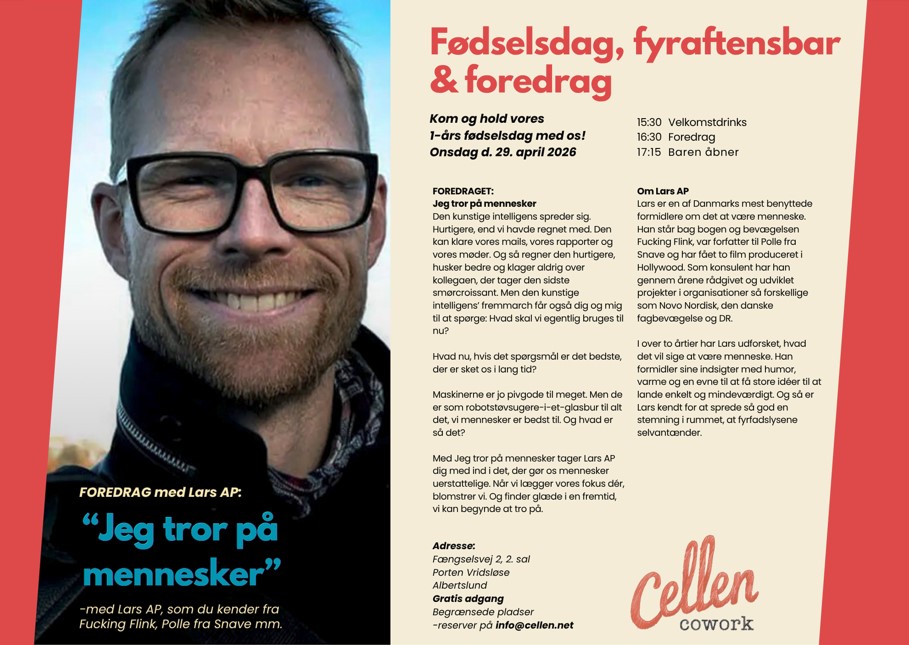 Fødselsdag og foredrag hos Cellen Cowork! I anledning af kontorfællesskabet Cellen Coworks 1års fødselsdag inviterer de til spændende foredrag med formidler Lars AP på Fængselsvej 2. onsdag eftermiddag d. 29 april